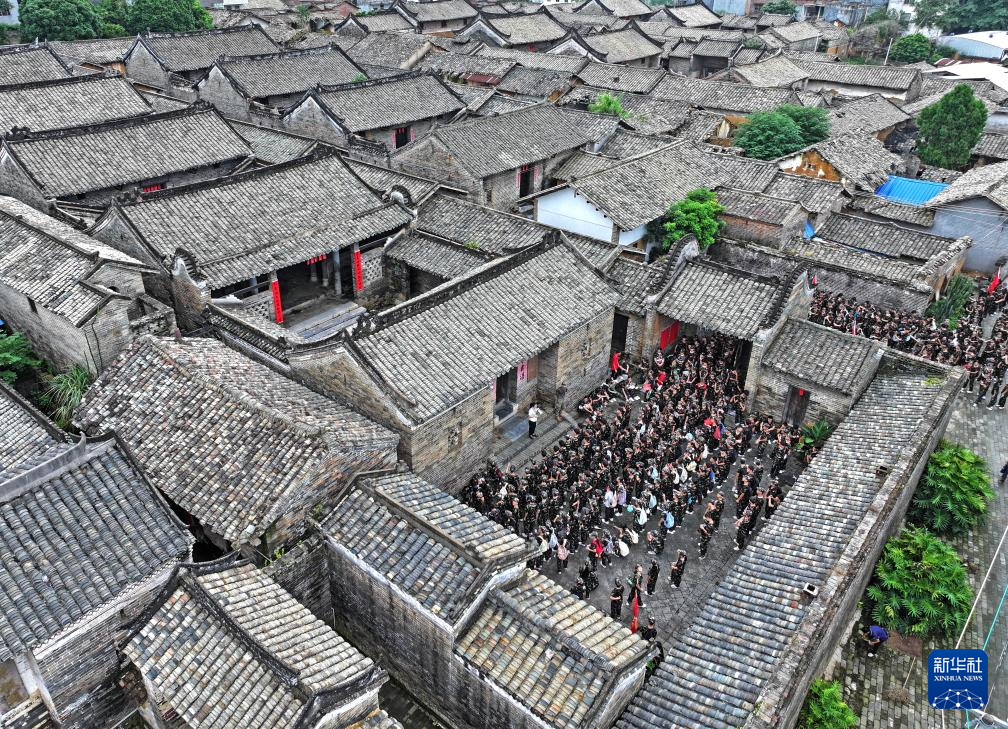 8月15日,楹联爱好者在大芦村古宅里写对联(无人机照片)。