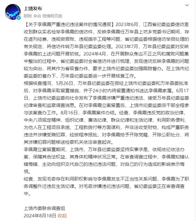 根据核查情况,5月26日,万年县纪委监委在报经上饶市纪委监委和万年县委批准后,对李佩霞采取留置措施,并于24小时内将留置通知书送达李佩霞家属。6月17日,上饶市纪委监委向社会发布了李佩霞涉嫌严重违纪违法、接受万年县纪委监委纪律审查和监察调查消息。在对李佩霞立案留置后,上饶市纪委监委派干部全程参与该案查办工作。8月16日,李佩霞案件办结。经查,李佩霞违反党的政治纪律、中央八项规定精神、组织纪律、廉洁纪律、群众纪律和生活纪律,利用职务便利,为他人在工程项目承揽、工程款拨付等方面谋利,并非法收受财物,构成严重职务违法并涉嫌受贿犯罪,经按程序报批,对李佩霞给予开除党籍、开除公职处分,将其涉嫌犯罪问题移送检察机关依法审查起诉。