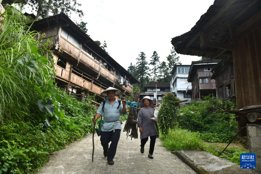 在融水苗族自治县杆洞乡尧告村,村民梁金玉(左)和妻子余兰英走在回家的路上(8月14日摄)。