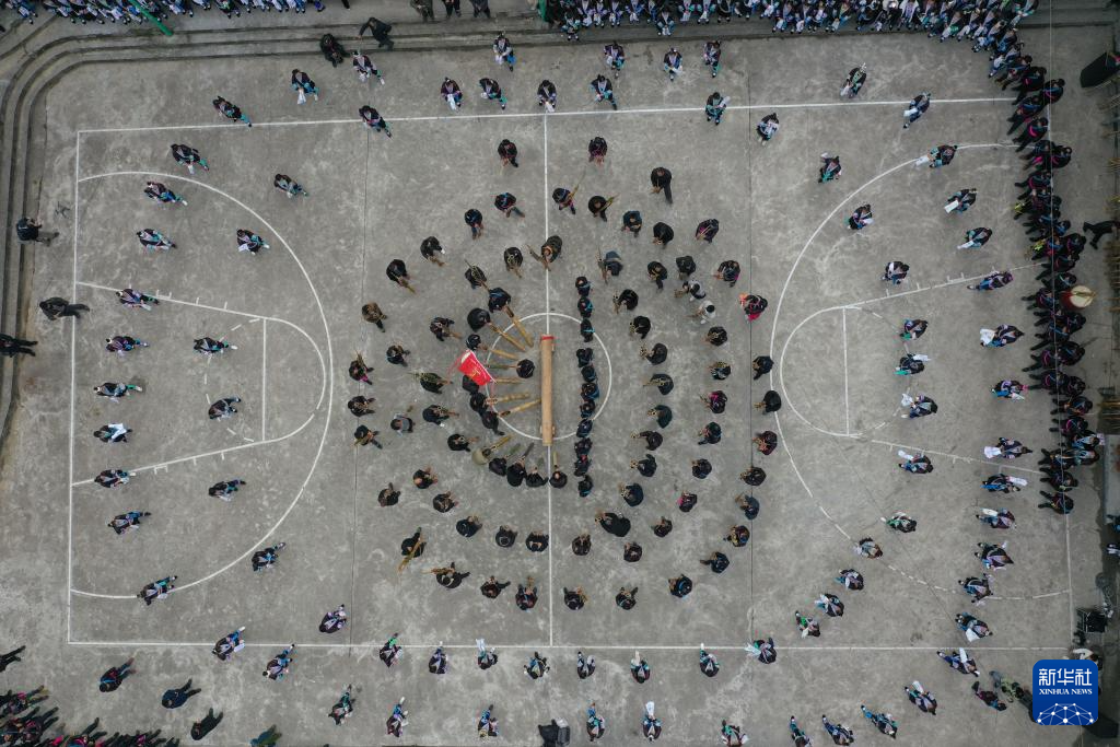 在融水苗族自治县杆洞乡尧告村,村民们在拉鼓祈福(无人机照片,2022年12月7日摄)。