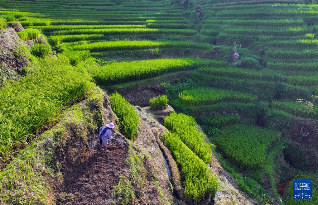 在融水苗族自治县杆洞乡尧告村,村民在稻田里劳作(无人机照片,8月15日摄)。