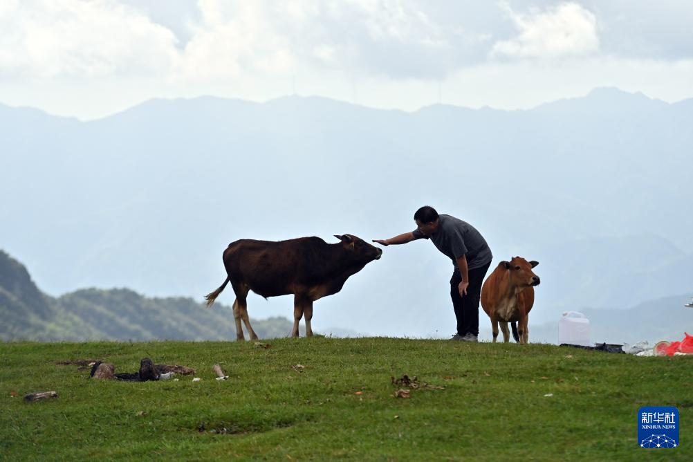 在融水苗族自治县杆洞乡尧告村高山牧场,几头黄牛在吃草(8月14日摄)。