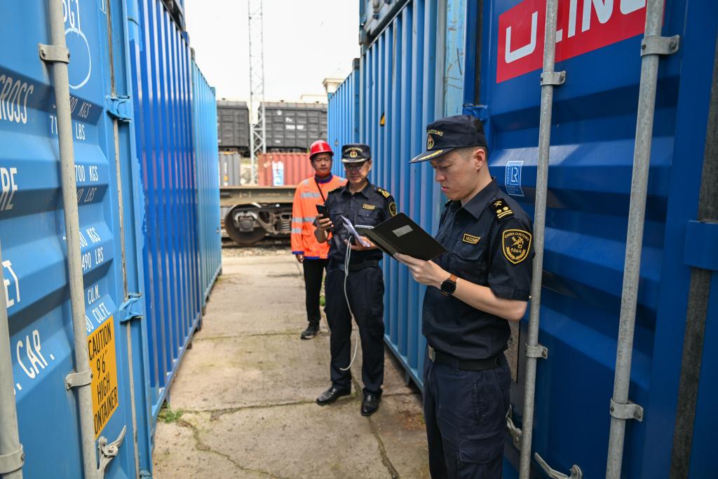 8月15日,在绥芬河铁路口岸集装箱换装场,绥芬河海关铁路查验一科关员对进境中欧班列货物进行查验。新华社记者 王松 摄