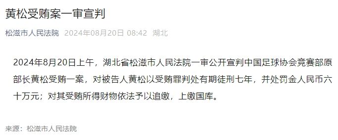 2024年8月20日上午,湖北省松滋市人民法院一审公开宣判中国足球协会竞赛部原部长黄松受贿一案,对被告人黄松以受贿罪判处有期徒刑七年,并处罚金人民币六十万元;对其受贿所得财物依法予以追缴,上缴国库。