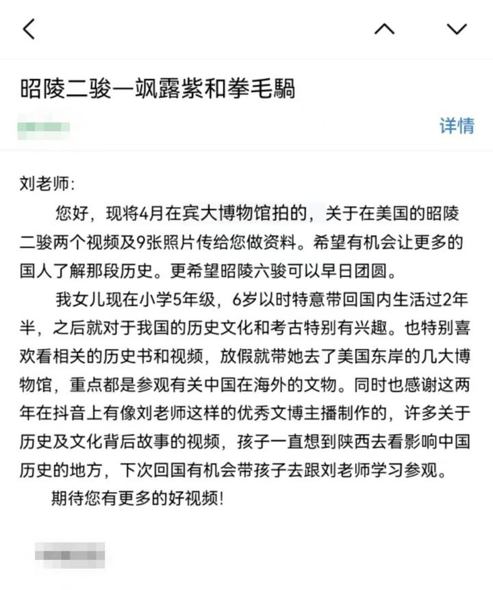 在邮件中,这位粉丝希望尽微薄之力让大家看到昭陵六骏团圆的画面,也希望刘国杨能把昭陵六骏的故事讲给更多人听。刘国杨说,类似这样的事情还有很多,与粉丝之间的温暖互动,让他觉得这份工作十分有意义。