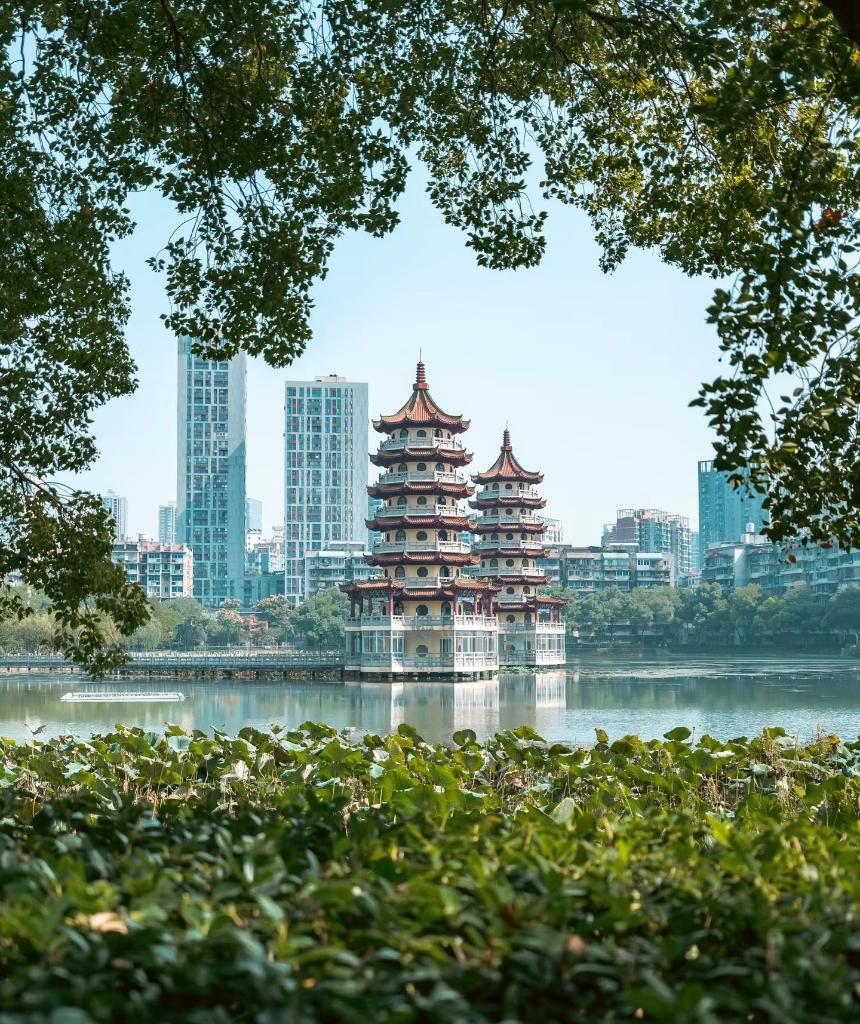 湖心岛上龙头翘角、八面飞檐的“龙虎塔”