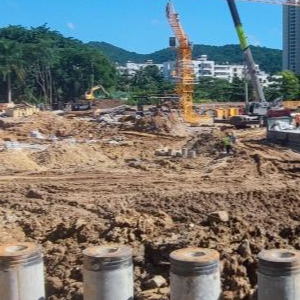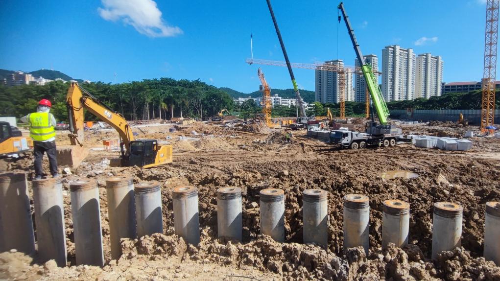挖掘机挥舞铁臂,渣土车来回穿梭。三亚市海罗片区城市更新项目(起步区)市场化商品房项目施工现场一派繁忙,工人们正加紧进行土方开挖、基坑支护、渣土清理等工作。