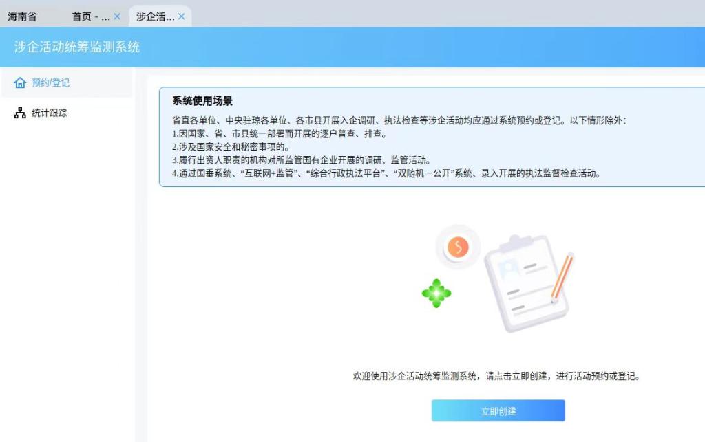 海南省涉企活动统筹监测系统预约/登记入口界面。