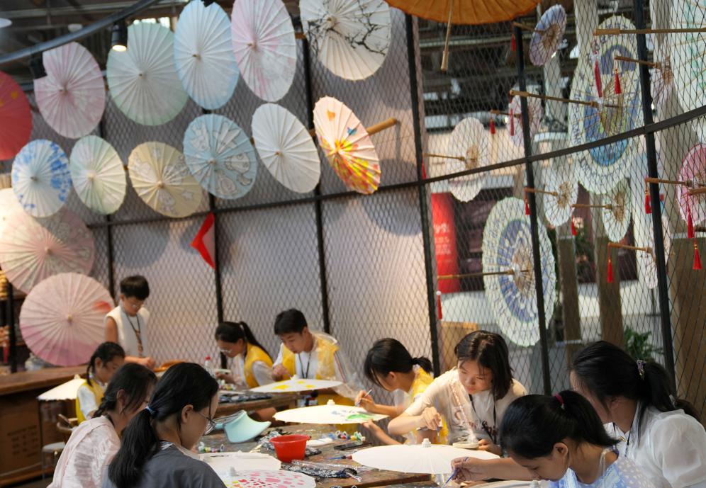 图为来自石家庄的学生在杭州手工艺活态馆研学体验伞面绘画(新华社记者韩传号 摄)