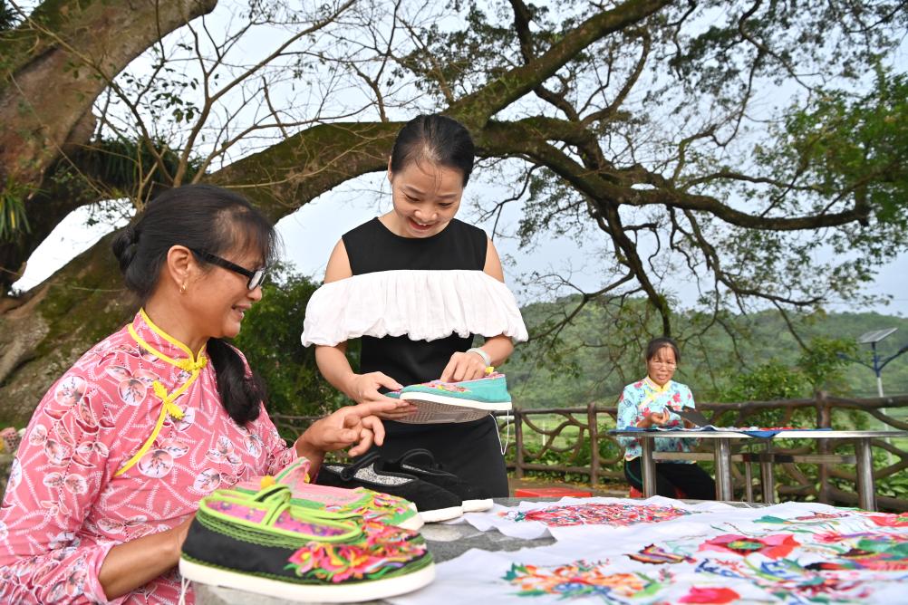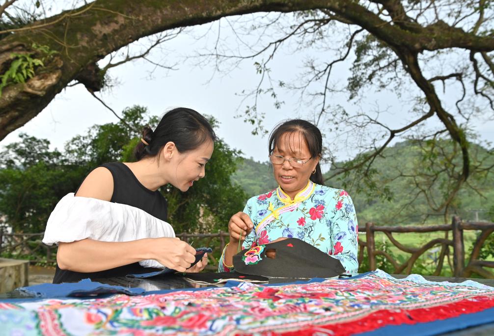 凌漫丽(左)在田东县义圩镇朔晚村巴查屯跟村民探讨刺绣针法(8月20日摄)。