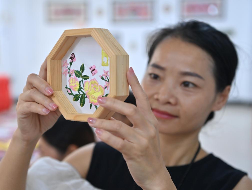 凌漫丽在田东县义圩镇七里刺绣基地展示她和村民以七里刺绣为基础创新制作的工艺品(8月20日摄)。