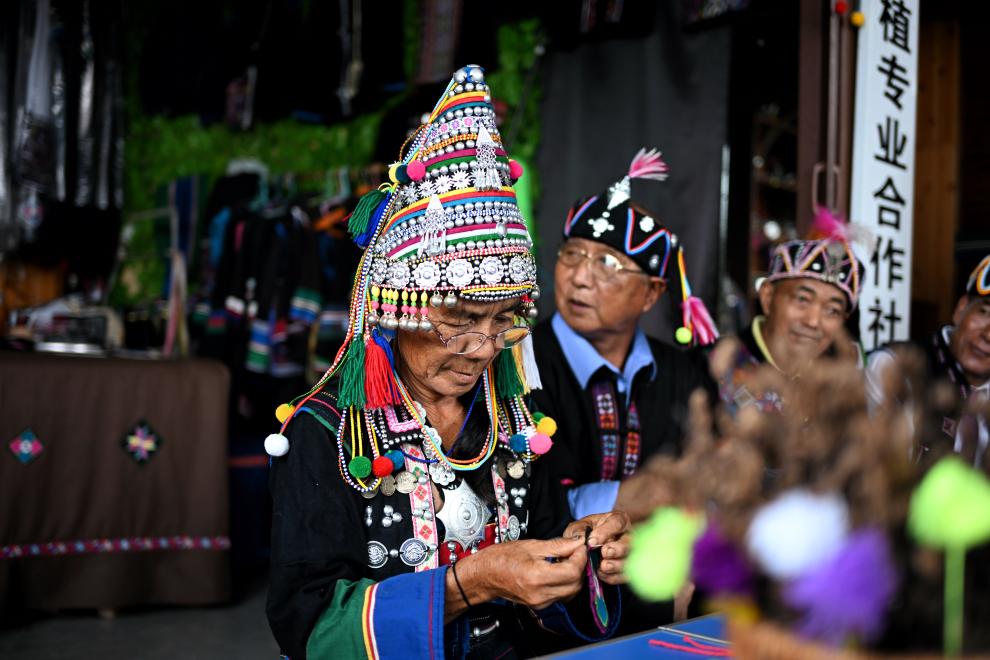 8月22日,大卡老寨的哈尼族妇女在制作跳蚤草香包。新华社记者辛悦卫 摄