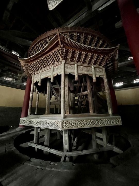 转轮藏指可以转动的经书架。它始建于北宋、直径达7米,榫卯相嵌形成一座古朴的八角亭。八根方柱自顶部向下收缩,将重量汇至一点。“如此巨大的木建筑,一两人就能推动,常令游客惊叹。”正定县隆兴文化旅游发展有限公司讲解员王玮瑶说。