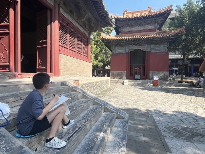夜幕低垂,华灯初上,身着汉服的女孩徐行古迹之间。烈日当头,少年定坐在古老建筑旁安静临摹,笔下的雕梁画栋多了朴拙意趣。“正定的古建筑很美,画之前要细细观察,但不能原封不动地画。画得好,就很满意、很开心。”今年12岁、从北京前来研学的米腾飞说。