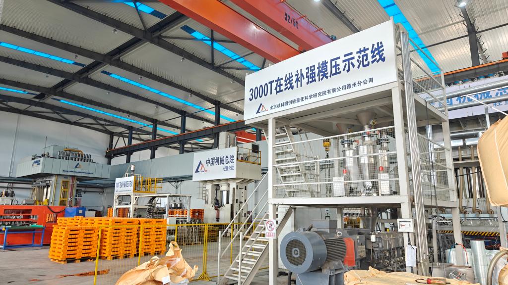 在北京机科国创轻量化科学研究院有限公司德州分公司,3000吨级在线补强模压示范线正在生产大型复合材料部件。新华社记者萧海川 摄