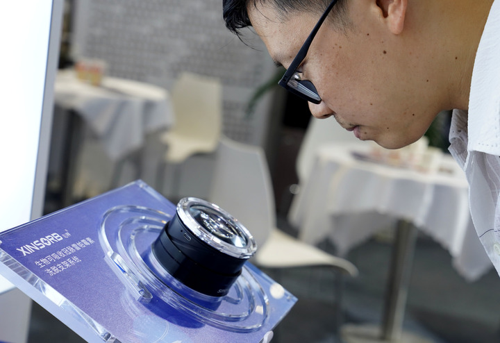 第二十三届中国国际工业博览会上,观众在复旦大学展台通过放大镜参观XINSORB生物可降解心脏支架。