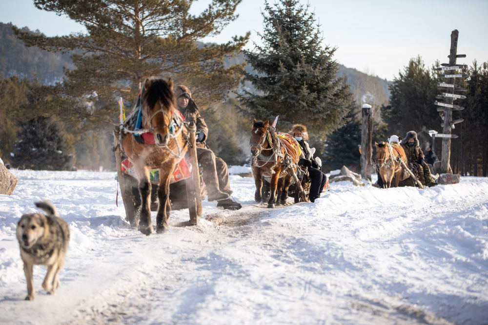 在黑龙江省漠河市北极村,游客乘坐马拉爬犁(2023年1月10日摄)。新华社记者 张涛 摄