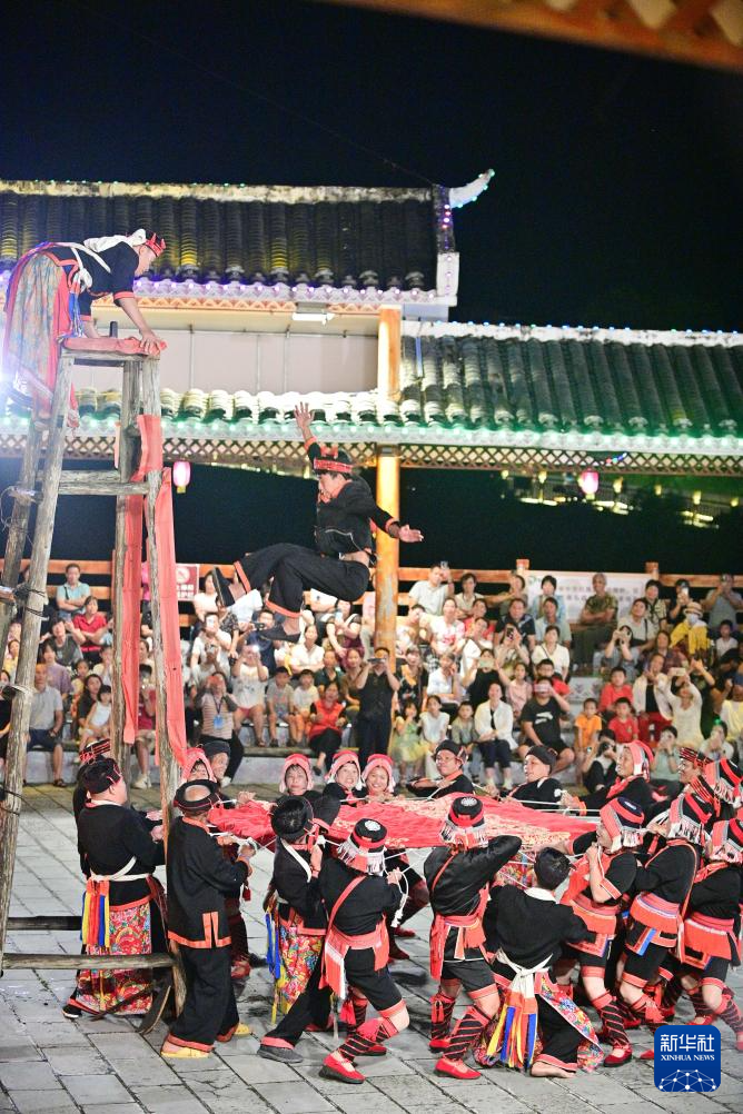 8月24日,瑶族民间绝技传承人在金秀瑶族自治县长垌乡平道村古占屯为游客表演“翻云台”。