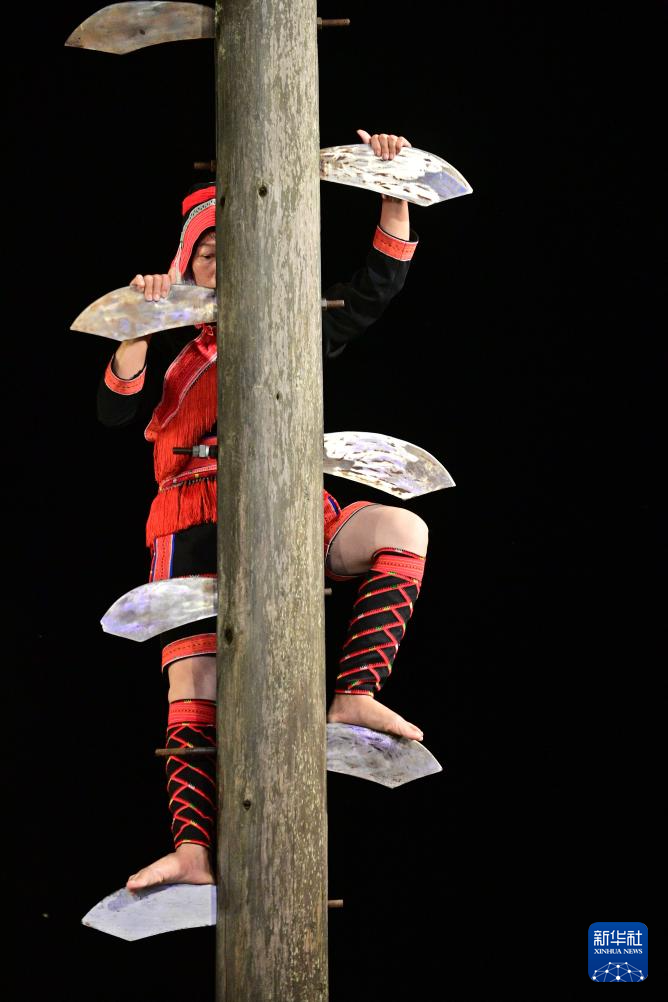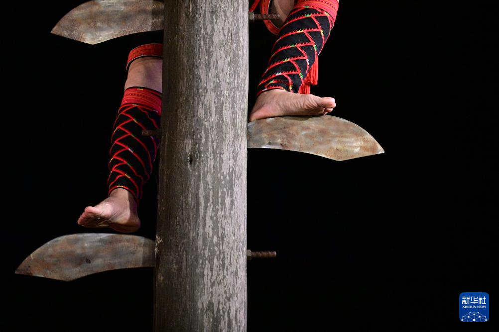 8月24日,瑶族民间绝技传承人在金秀瑶族自治县长垌乡平道村古占屯为游客表演“上刀山”。