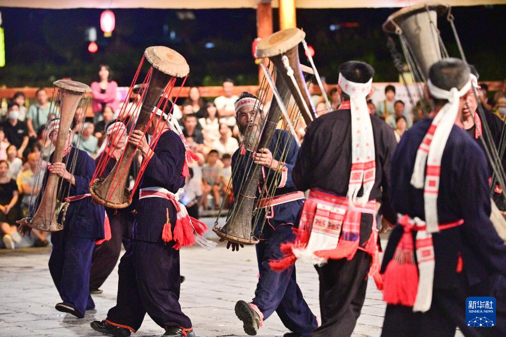 8月24日,表演者在金秀瑶族自治县长垌乡平道村古占屯为游客展示国家级非遗项目黄泥鼓舞。