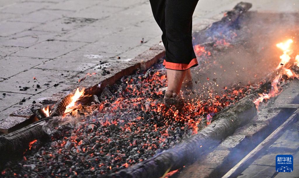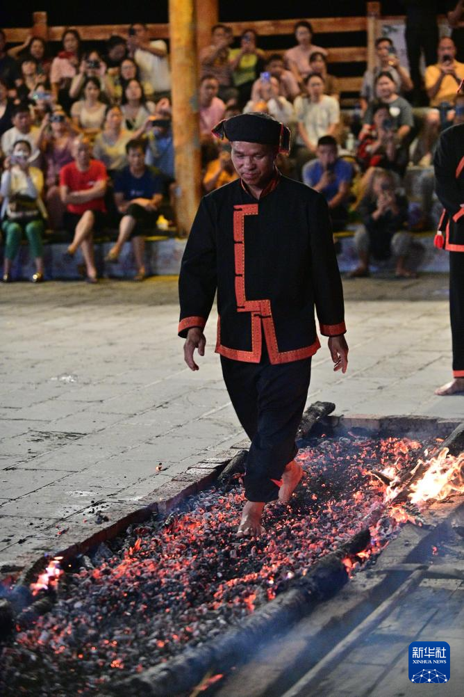 8月24日,瑶族民间绝技传承人在金秀瑶族自治县长垌乡平道村古占屯表演“下火海”。
