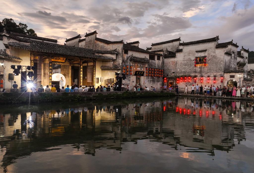 7月25日晚,游客在黄山市黟县宏村月沼旁欣赏音乐会表演。新华社发(施亚磊摄)