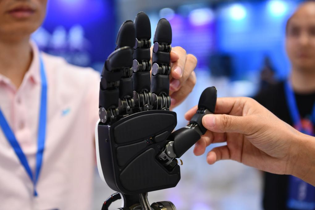 8月26日,深圳智能机器人灵巧手产业发展大会上观众感受智能机器人灵巧手的关节活动。新华社记者 梁旭 摄