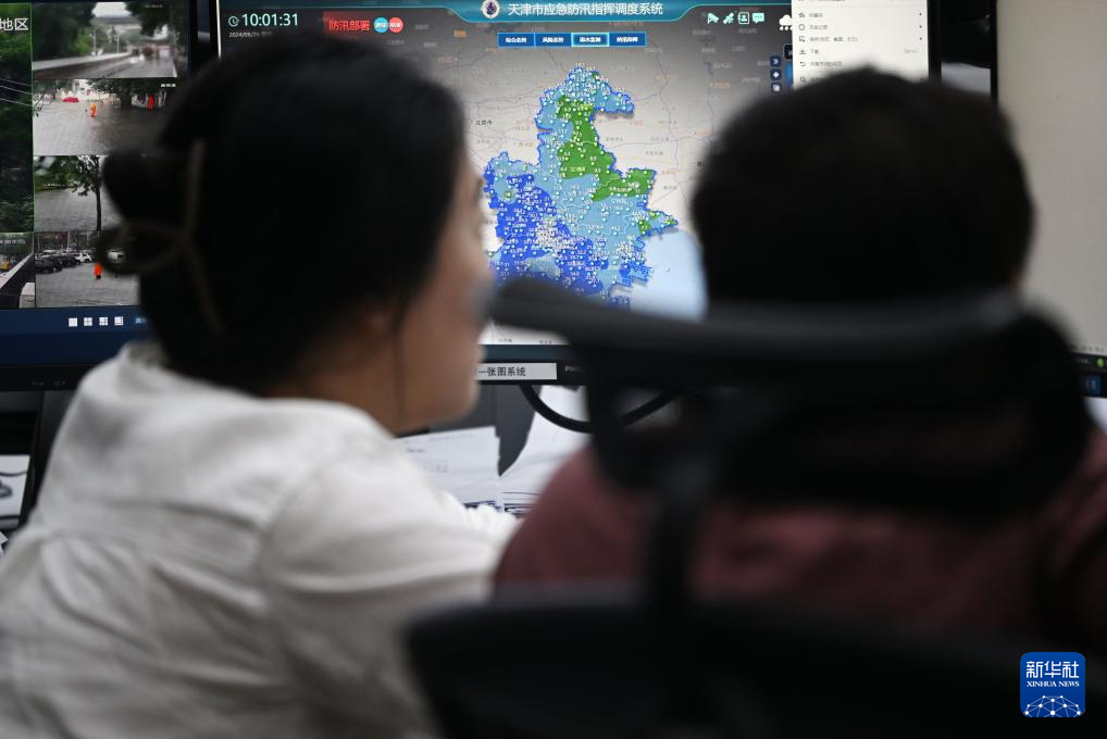 8月26日,工作人员在天津市应急管理局指挥中心值守。新华社记者 李然 摄