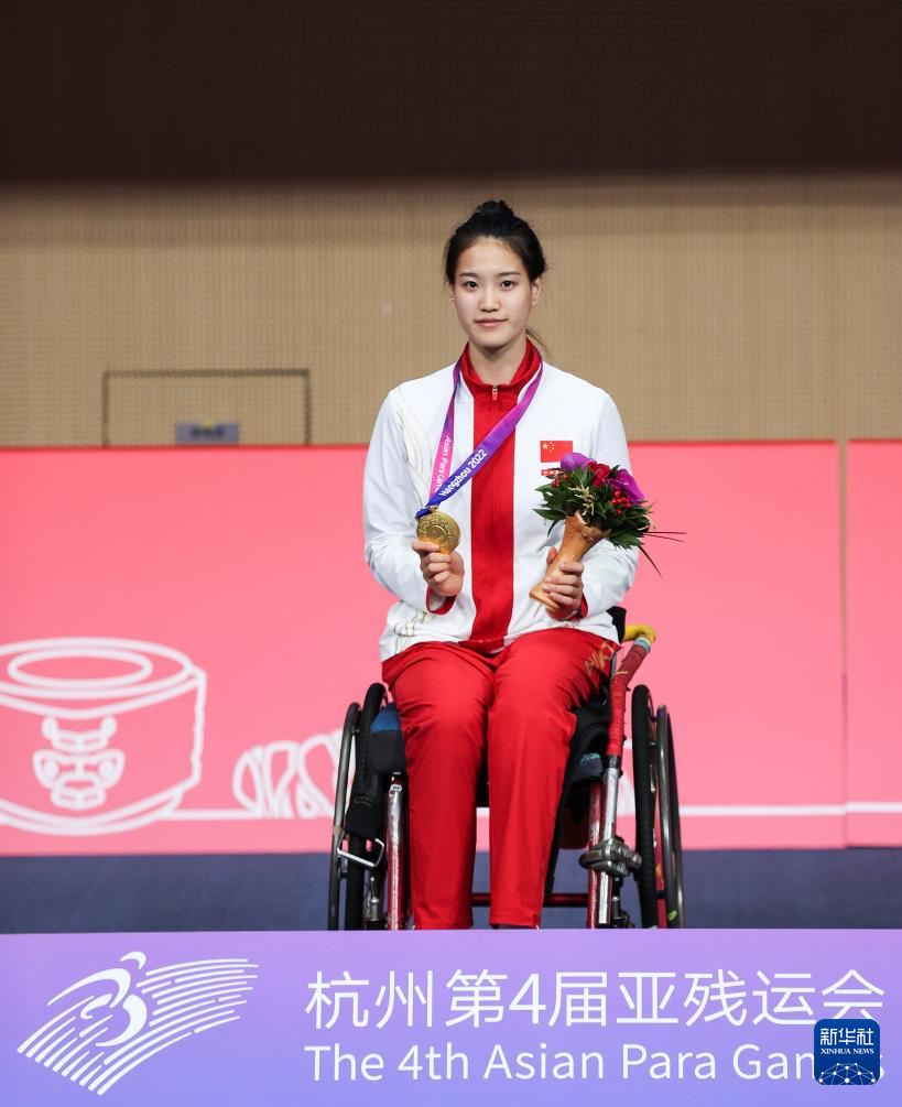 图为2023年10月23日,中国选手辜海燕在杭州第4届亚残运会轮椅击剑项目女子花剑个人颁奖仪式上。新华社记者 胡星宇 摄