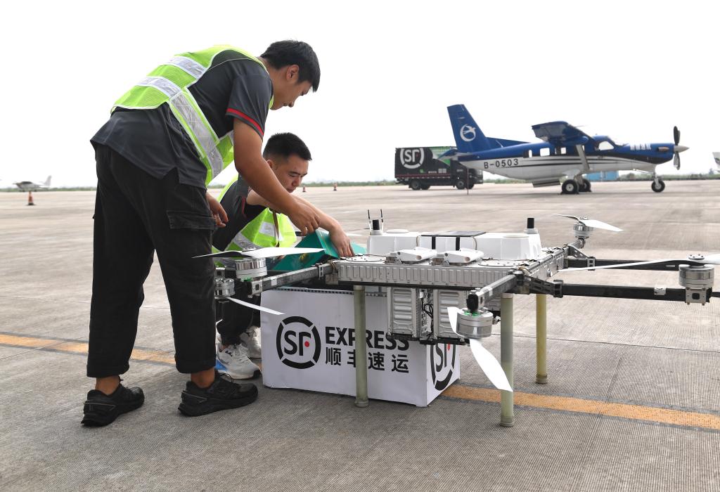 6月28日,工作人员将贵阳特色农产品快递装进无人机。新华社记者 刘坤 摄
