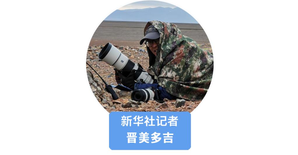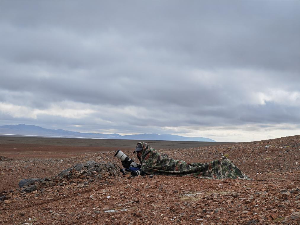 新华社记者晋美多吉在山坡上等待藏羚羊群。