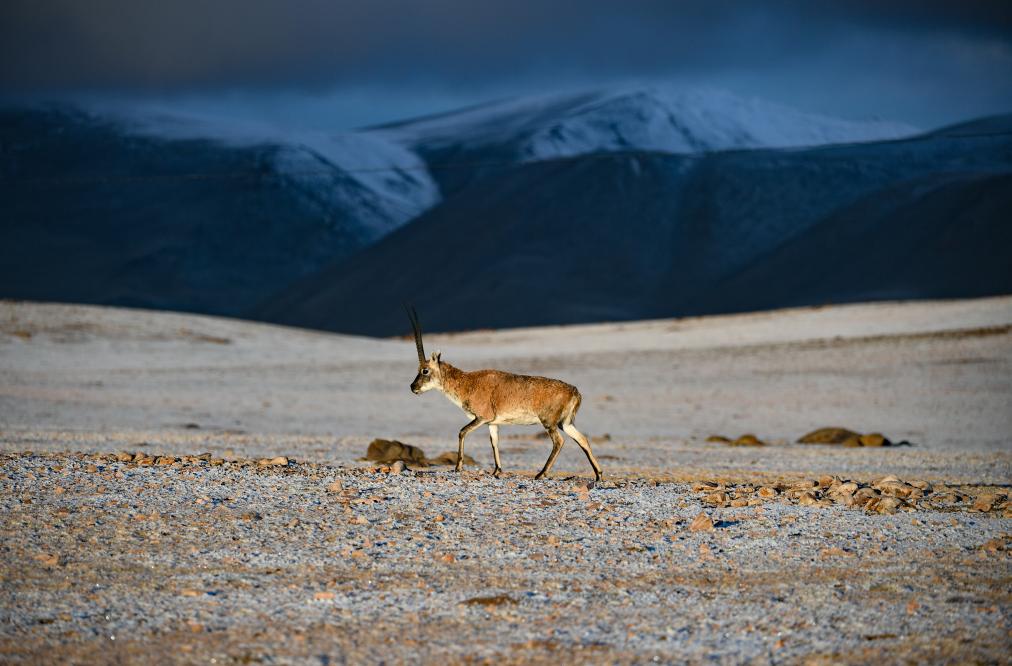 那曲市申扎县买巴乡鲁确塘草原上,夕阳下的母藏羚羊(2024年6月16日摄)。