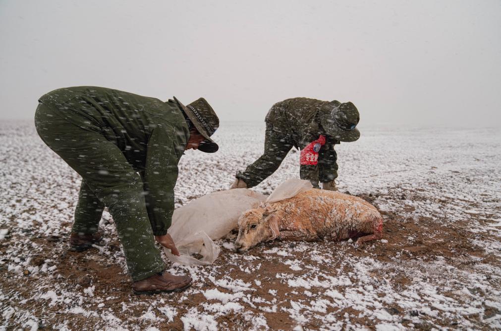 羌塘国家级自然保护区的野保员在查看受伤的母藏羚羊(2024年6月14日摄)。