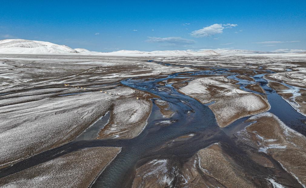 空中俯瞰藏羚羊排队穿过甜水河(无人机照片,2024年6月15日摄)。