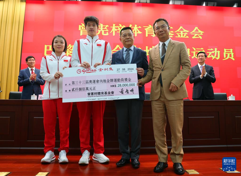 新华社北京8月27日电(记者郁思辉)曾宪梓体育基金会巴黎奥运会内地金牌运动员颁奖仪式27日下午在京举行。曾宪梓体育基金会理事长曾智明、副理事长曾智雄向巴黎奥运会内地金牌运动员颁发了奖金支票,奖金总额为港币2800万元。