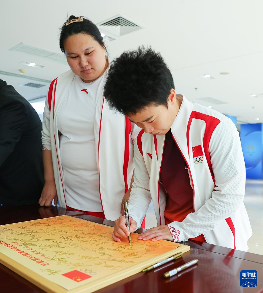 8月27日,巴黎奥运会内地金牌运动员侯志慧(右)、李雯雯在颁奖仪式前签名留念。新华社记者 丁旭 摄