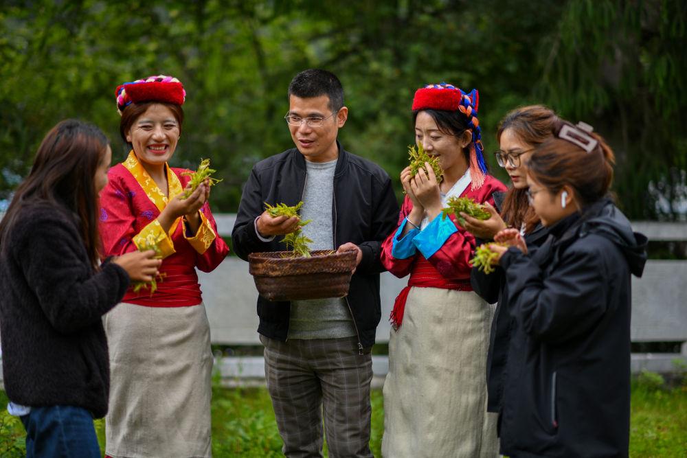 安徽省援藏干部王天柱(左三)为西藏错那市的贡日门巴民族乡斯木村干部群众讲解莓茶采摘技术要求(2023年7月28日摄)。新华社记者 姜帆 摄