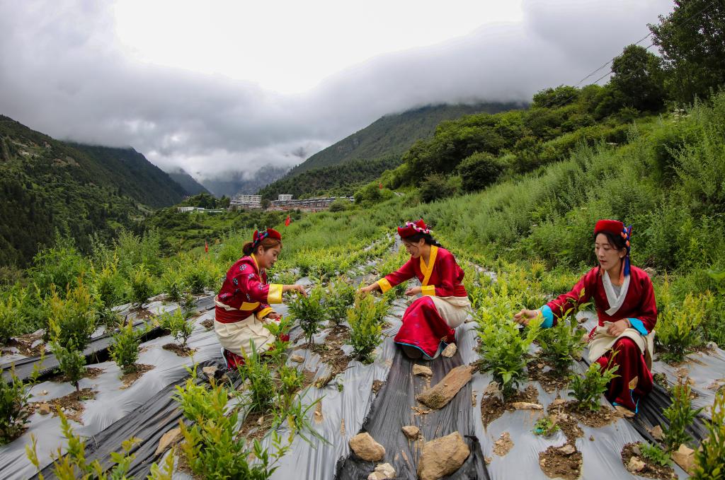 2022年,安徽省援藏工作队在勒布沟引入莓茶种植,试验性种植30亩,已开始采摘和制作,预计年带动就业200人以上。这是当地村民在采摘莓茶(2023年7月28日摄)。新华社记者 旦增尼玛曲珠 摄