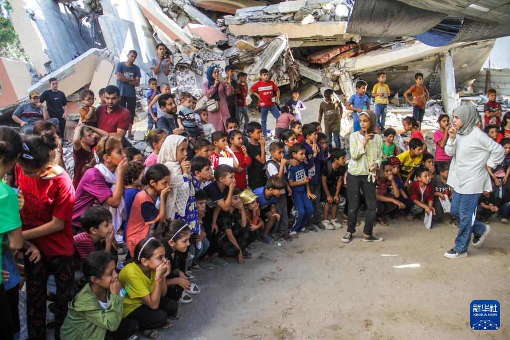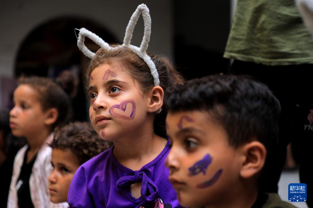 在加沙地带南部城市汗尤尼斯,巴勒斯坦儿童参加当地志愿者组织的关爱儿童活动(6月7日摄)。新华社发(里泽克·阿卜杜勒贾瓦德 摄)