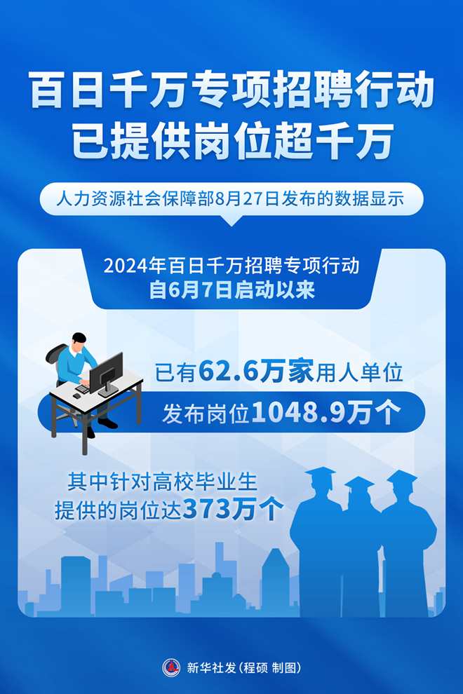 新华社北京8月27日电(记者姜琳)人力资源社会保障部27日发布的数据显示,2024年百日千万招聘专项行动自6月7日启动以来,已有62.6万家用人单位发布岗位1048.9万个,其中针对高校毕业生提供的岗位达373万个。