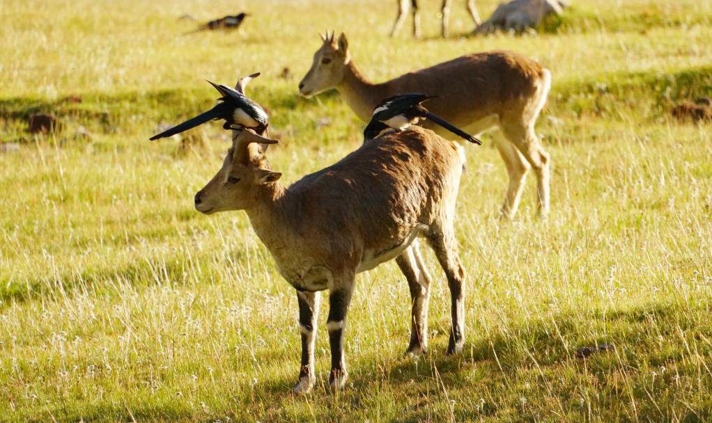 8月23日拍摄的青藏喜鹊和岩羊。(自然观察者赵颖 摄)