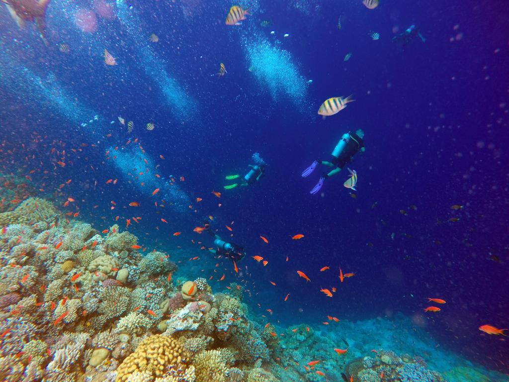 2023年10月2日,人们在埃及西奈半岛达哈布蓝洞内的珊瑚旁深潜。新华社记者 隋先凯 摄