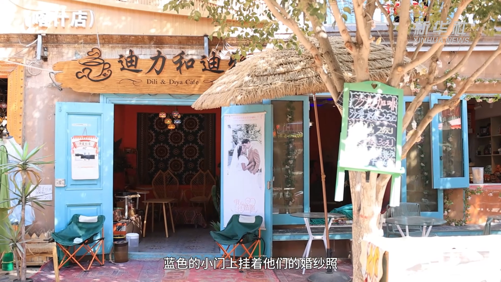 咖啡馆木制的门头雕刻着夫妻俩的名字,蓝色的小门上挂着他们的婚纱照,照片里的海迪雅来自非洲东部坦桑尼亚桑给巴尔岛,迪力夏提是新疆喀什本地人。