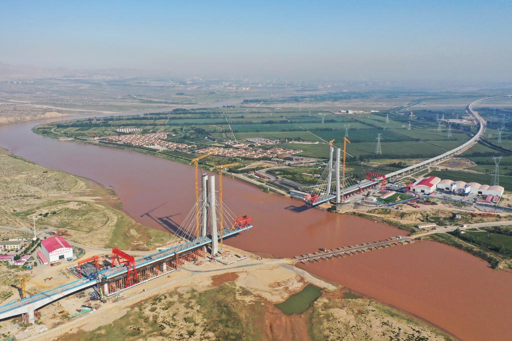 这是8月23日拍摄的包银高铁乌海黄河特大桥建设现场(无人机照片)。新华社记者 李志鹏 摄