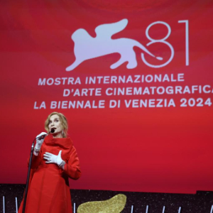 8月28日,在意大利威尼斯,第81届威尼斯电影节主竞赛单元评审团主席伊莎贝尔·于佩尔在开幕式上致辞。
