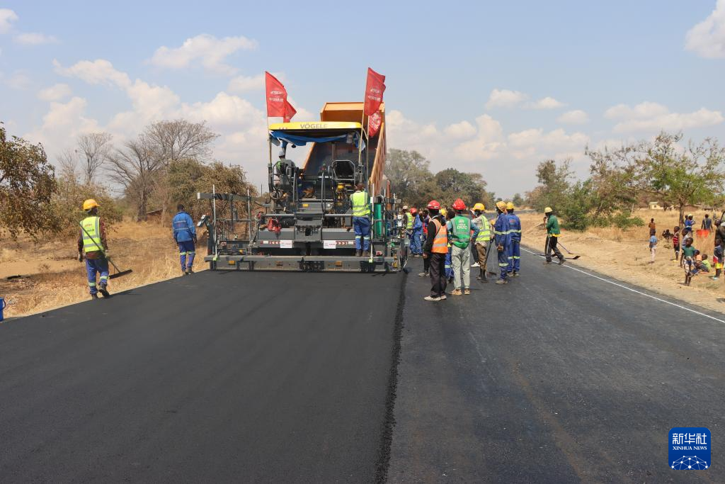 8月27日,在马拉维恩科塔科塔,施工人员在升级改造项目路段铺筑沥青路面。新华社发