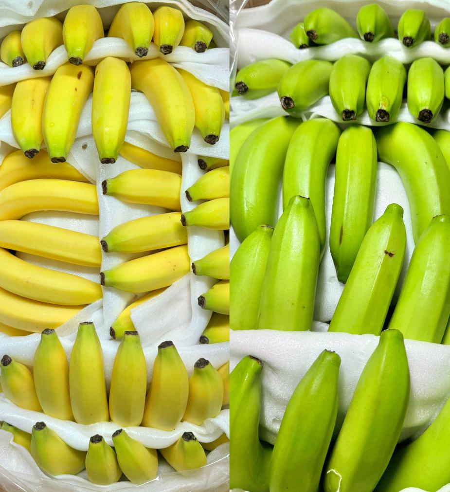 “雾浴”后(左)与“雾浴”前(右)的香蕉对比。(许海峰 2024年8月29日摄)