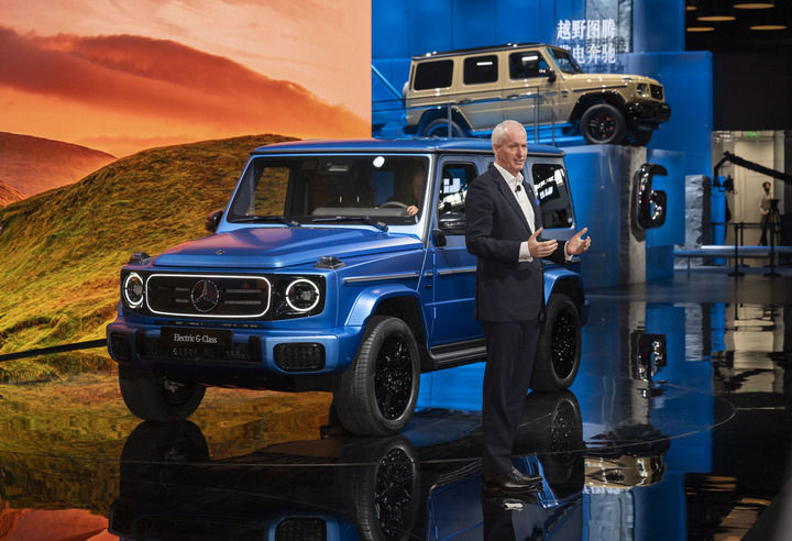 2024年4月25日,在北京中国国际展览中心顺义馆举行的2024北京车展上,梅赛德斯—奔驰集团股份公司董事会成员唐仕凯介绍梅赛德斯—奔驰纯电G级越野车。新华社记者 才扬 摄