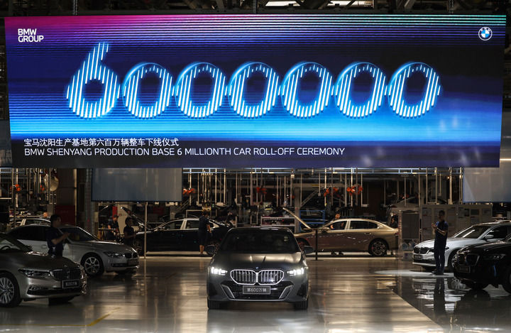 这是2024年5月8日在宝马沈阳生产基地拍摄的华晨宝马第600万辆整车下线仪式。新华社记者 潘昱龙 摄