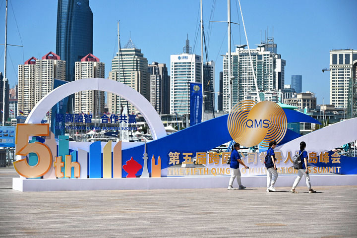 2024年8月28日,几名志愿者从第五届跨国公司领导人青岛峰会会场背景墙前经过。新华社记者 李紫恒 摄